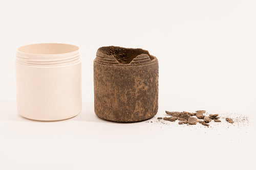 Your pot is made from a material crafted from responsibly sourced raw materials, primarily wood-fibres and agricultural byproducts like crop residues that would typically be considered waste. By repurposing them, we’re helping reduce waste in landfills. It’s biodegradable and compostable, meaning it can be digested by naturally occurring microorganisms, leaving no microplastics or toxic load behind. The speckles come from the natural byproducts, giving the pot a beautiful earthy look and a ceramic-like feel.